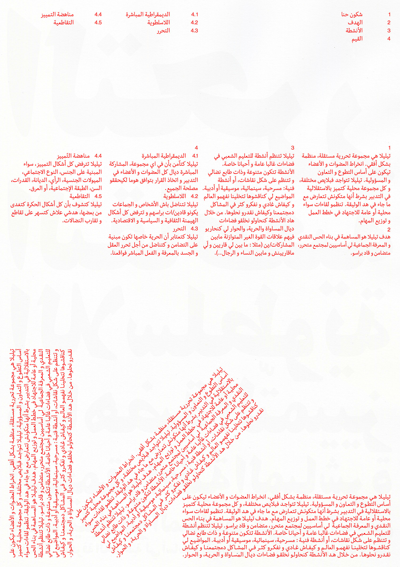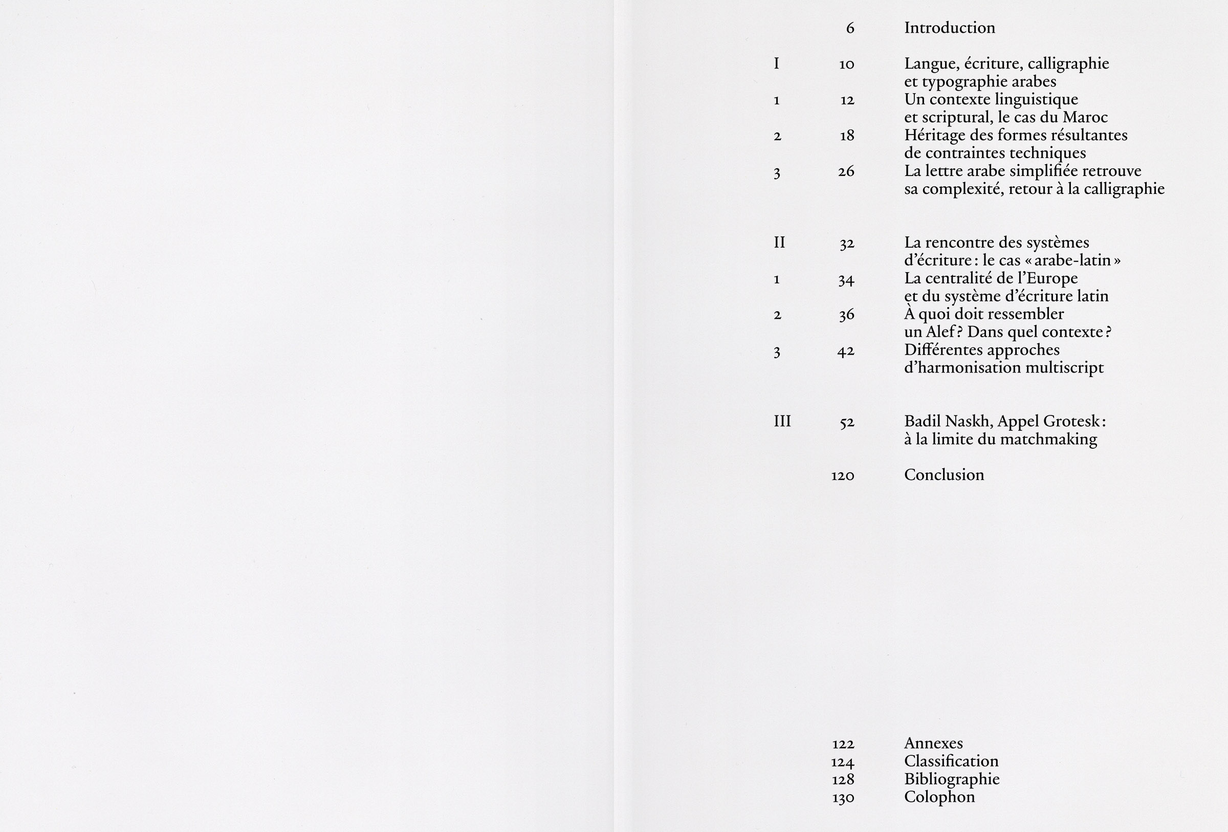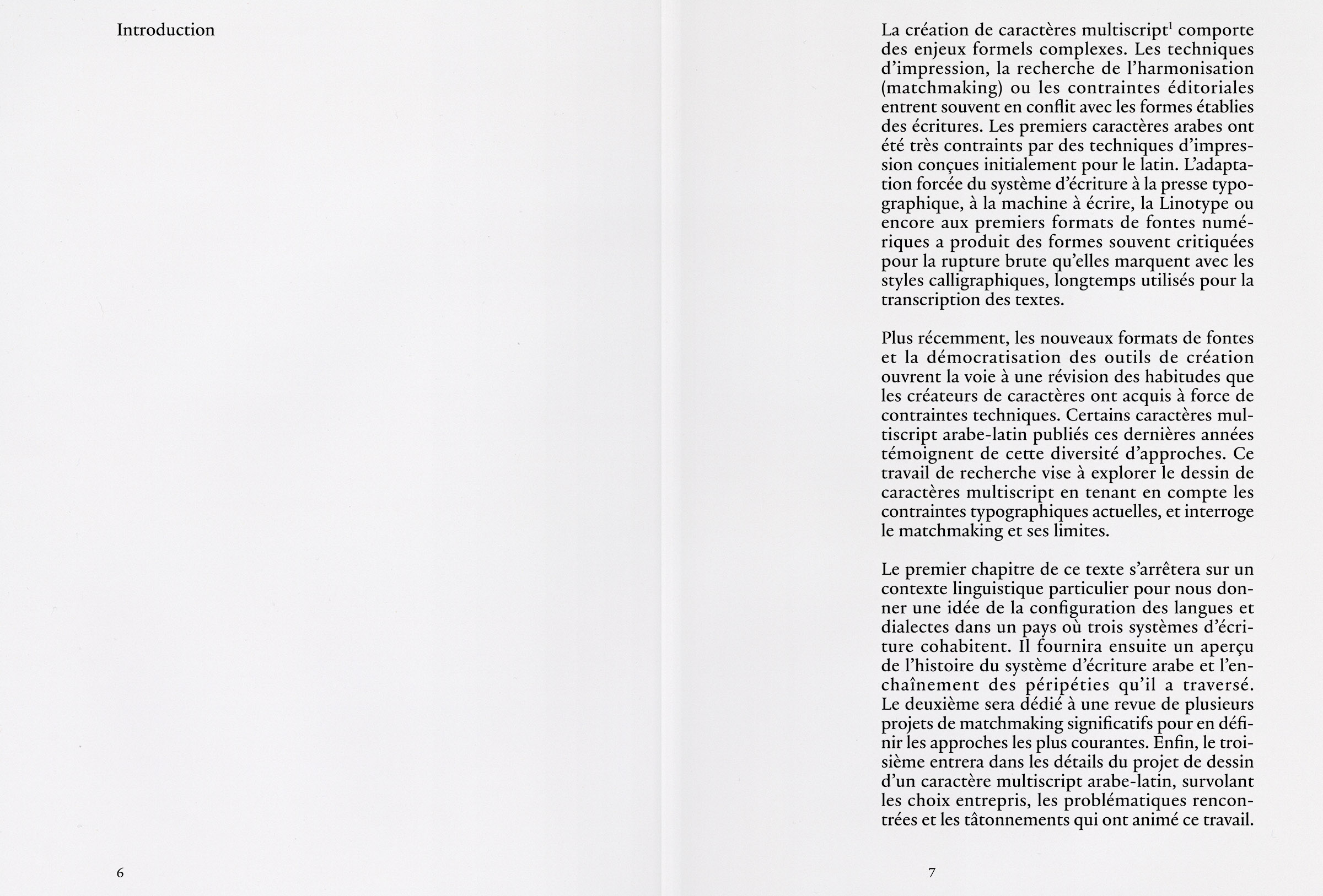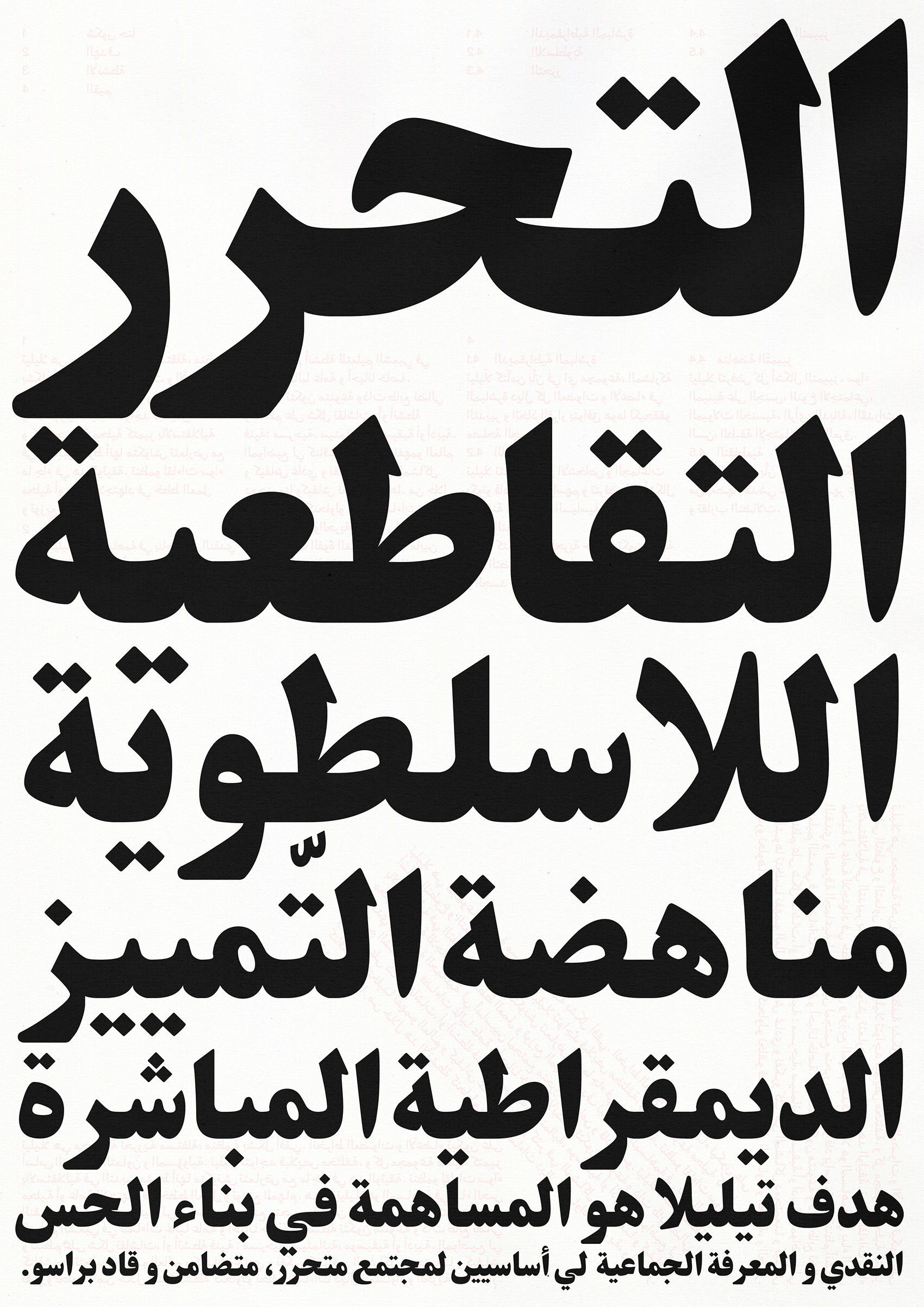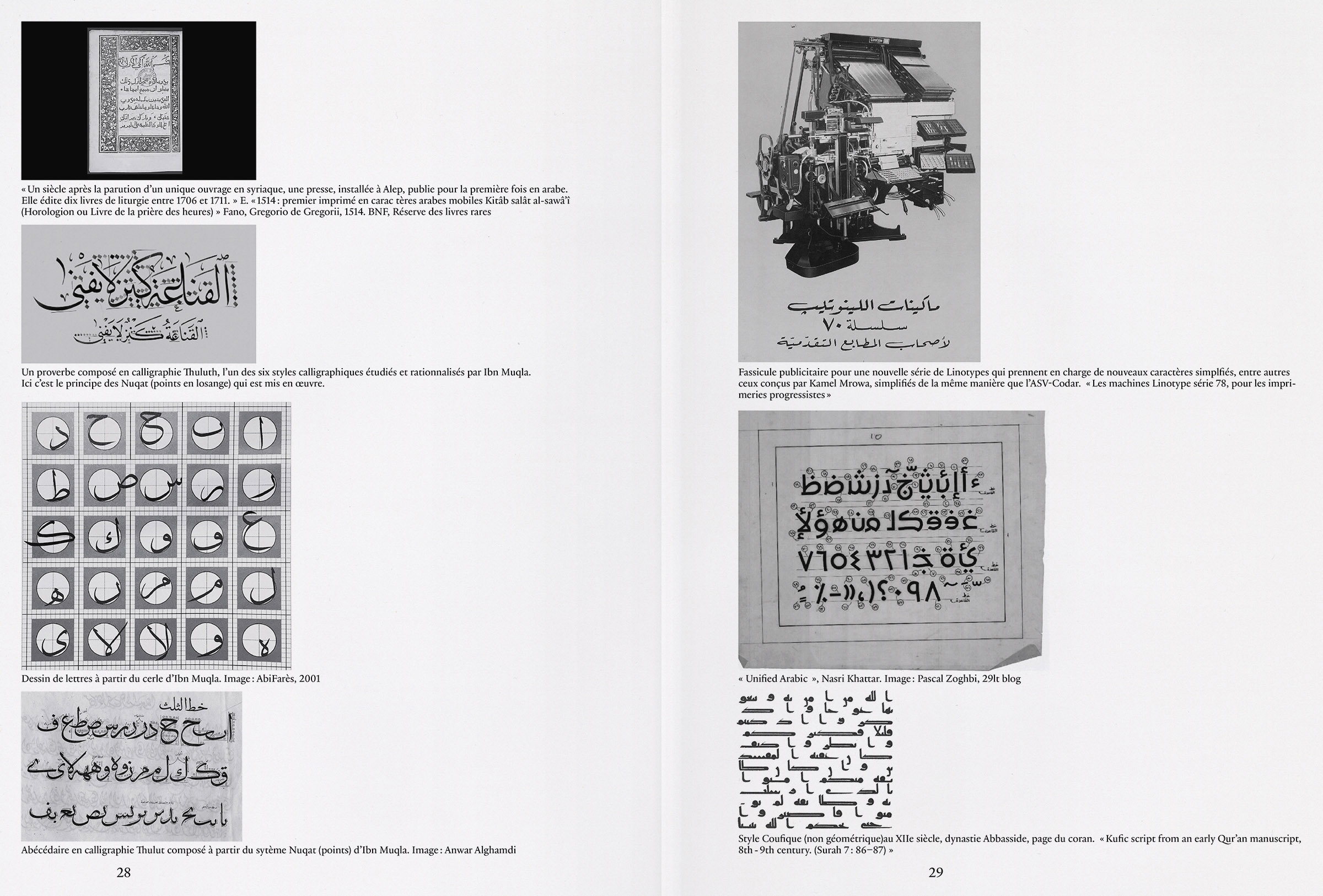 The research held at the Atelier national de recherche typographique between october 2016 and march 2018 explores the evolution of Arabic typography from the early printing techniques to the digital era. In addition to the constraints of unsuitable printing methods, the conflictual encouter with the Latin script had a significant impact on the way designers approach the Arabic script.